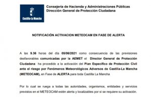 Activación del Plan Específico de Protección Civil ante el riesgo por Fenómenos Meteorológicos Adversos de Castilla -La Mancha (METEOCAM) en Fase de ALERTA...