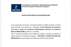 Como consecuencia de lluvias y tormentas en Castilla -La Mancha, el día 5 de junio de 2021, la Dirección del Plan Específicos de Protección Civil ante el...