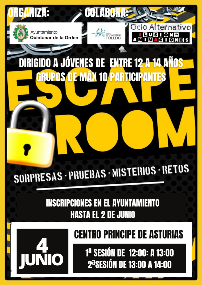 El próximo 4 de junio, en el Centro Príncipe de Asturias tendrá lugar en Escape Room dirigido a jóvenes de entre 12 y 14 años de edad. Las insripciones deberán realizarse en el Ayuntamiento hasta el 2 de junio. Los grupos deberán ser de máximo 10 participantes y habrá dos sesiones. |