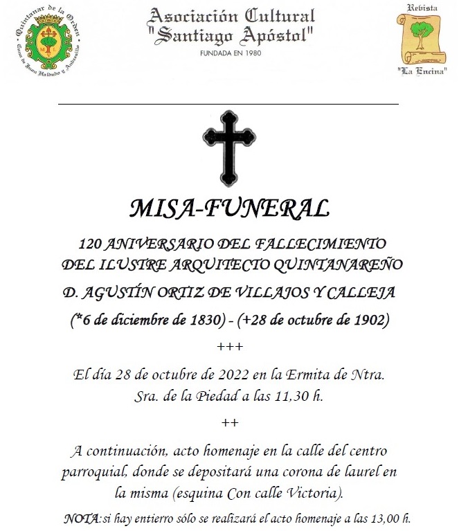 El próximo viernes, 28 de octubre a las 11.30 horas en la Ermita de la Ntra. Sra. de la Piedad se celebrará una Misa-Funeral en memoria del ilustre arquitecto quintanareño Agustín Ortiz de Villajos y Calleja como un acto más del 120 aniversario de su fallecimiento. Posteriormente, tendrá lugar un acto homenaje en la calle […] |