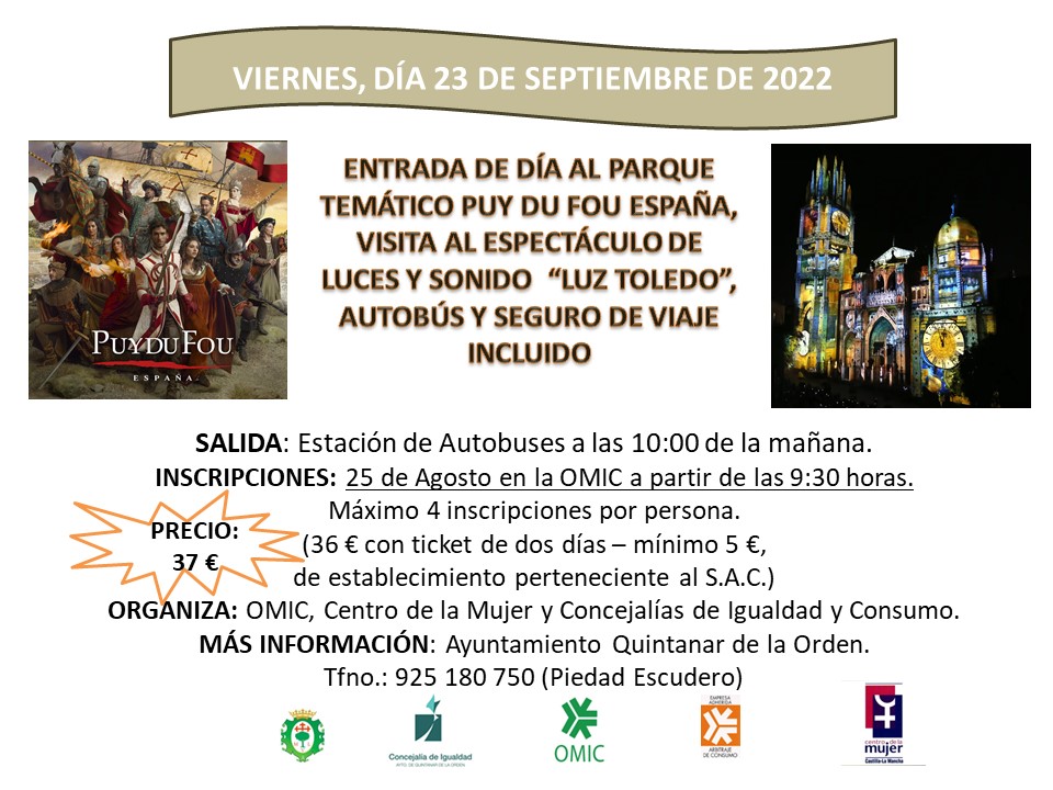 VIAJE A PUY DU FOULas Concejalías de Igualdad y Consumo, la OMIC y el Centro de la Mujer de Quintanar de la Orden organizan un viaje a Puy Du Fou para el próximo 23 de septiembre con entrada de Día al Parque y visita al espectáculo de Luces y Sonido "Luz Toledo". Las inscripciones se […]