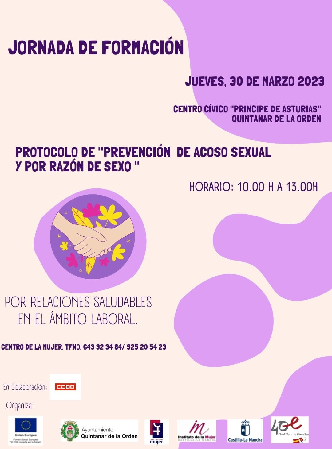 Jornada de Formación sobre "Protocolo de prevención de acoso sexual y por razón de sexo" el próximo 30 de marzo de 10 a 13 horas en el Centro Cívico.Organiza el Centro de la MujerMás información e inscripciones en los teléfonos: 643323484/925205423