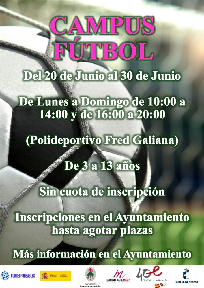 Campus de Fútbol del 20 al 30 de junio de lunes a domingo de 10 a 14 horas y de 16 a 20 horas en el Polideportivo Fred Galiana. Para chicos y chicas entre 3 y 13 años. Sin cuota de inscripción. Inscripciones en el Ayuntamiento hasta agotar plazas.