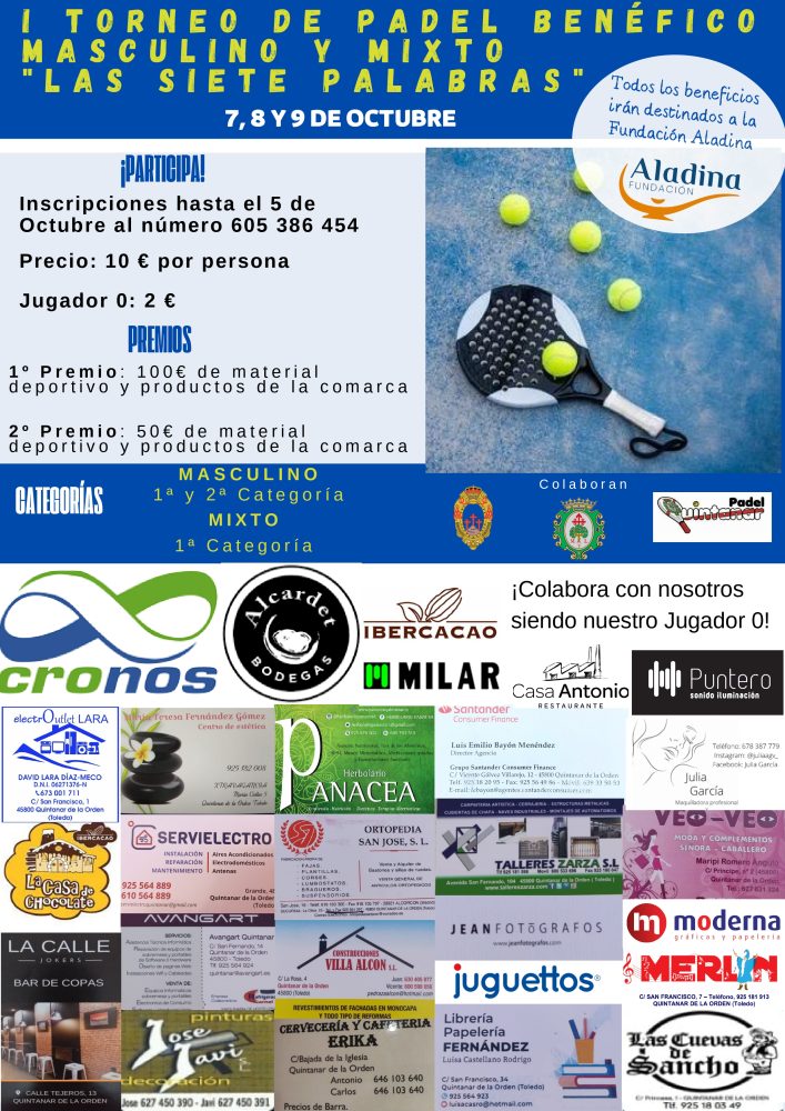 Los días 7, 8 y 9 de octubre se celebrará un Torneo de Pádel Benéfico a favor de la Fundación Aladina Las inscripciones podrán realizarse hasta el 5 de octubre en el teléfono 605 386 454 con un precio de 10 euros por persona aunque también se podrá colaborar con jugador 0 con 2€ Habrá […] |