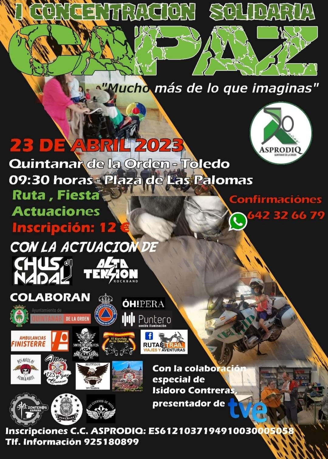 El próximo 23 de abril de 2023 se celebrará en Quintanar de la Orden la I CONCENTRACIÓN SOLIDARIA CAPAZ. Comenzará a las 9:30 horas en la Plaza de las Palomas. |