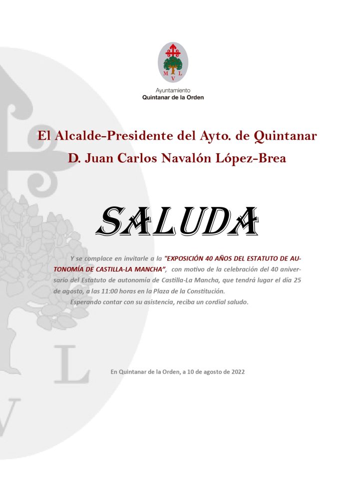 Con motivo de la celebración del 40 aniversario del Estatuto de autonomía de Castilla-La Mancha, e jueves, 25 de agosto, a las 11.00 horas en la Plaza de la Constitución se inaugurará una exposición sobre el Estatuto de Autonomía.