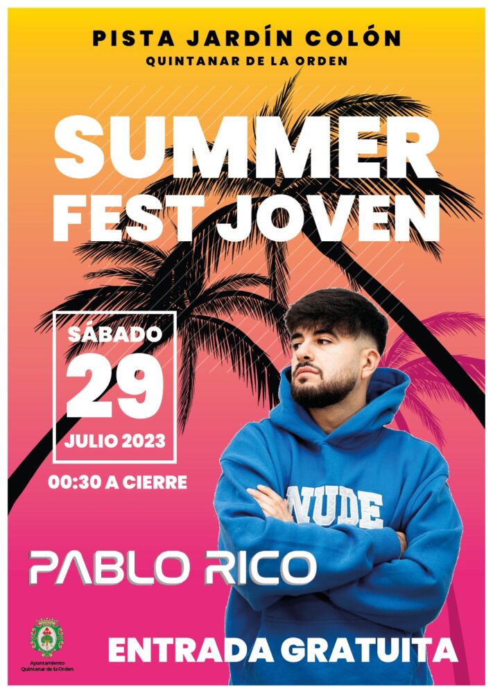 El próximo 🗓️ sábado 29 de julio📍 en la Pista Jardín Colón 🕛 de 00:30 a cierre y, de la mano de Pablo Rico llega a Quintanar de la Orden el SUMMER FEST JOVEN. No te lo pierdas y pasa una divertida noche 🤗🤗 ENTRADA GRATUITA‼️ |