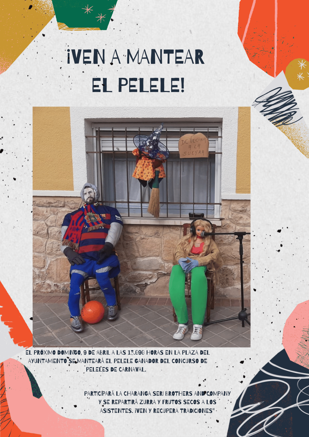 ESTE DOMINGO, VEN A MANTEAR LOS PELELES El domingo de Resurrección, a las 13.00 horas en la Plaza del Ayuntamiento se mantearán los peleles ganadores del concurso de Carnaval.El acto estará amenizado por la Charanga Seri Brothers and Company y se repartirá zurra y frutos secos a los asistentes. ¡Ven y recupera tradiciones!