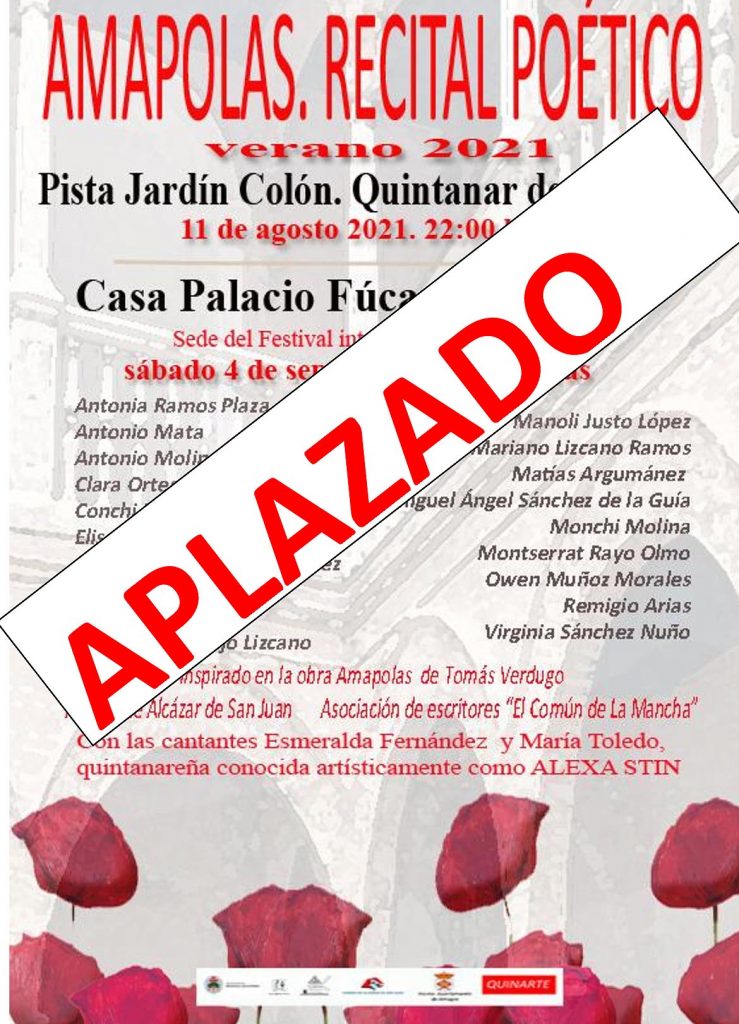 El Recital Poético Amapolas previsto para la noche de este miércoles, 11 de agosto, ha tenido que ser aplazado debido a las inclemencias meteorológicas