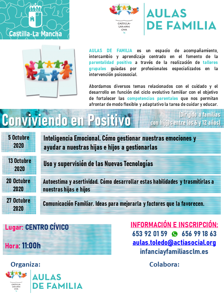 Los talleres, dirigidos a familias con hijos e hijas con edades comprendidas entre los 6 y los 12 años de edad se centrarán en temas como la inteligencia emocional, el uso y supervisión de las Nuevas Tecnologías, el Autoestima y asertividad o la comunicación familiar. Se llevarán a cabo las mañanas del 5, 13, 20 y 27 de octubre a partir de las 11 de la mañana con todas las medidas de seguridad establecidas. Los interesados pueden inscribirse y solicitar información en los teléfonos: 653920159-656991863 o en el correo electrónico: aulas.toledo@actiasocial.org.