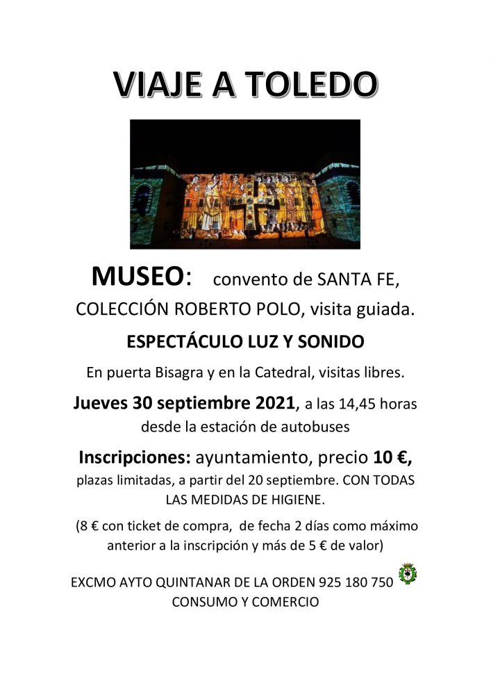 Desde la Concejalía de Comercio y Consumo han organizado un viaje a Toledo para el próximo 30 de septiembre al Convento de Santa Fe para realizar una visita guiada a la Colección Roberto Polo y al espectáculo de Luz y Sonido en la Puerta Bisagra y...