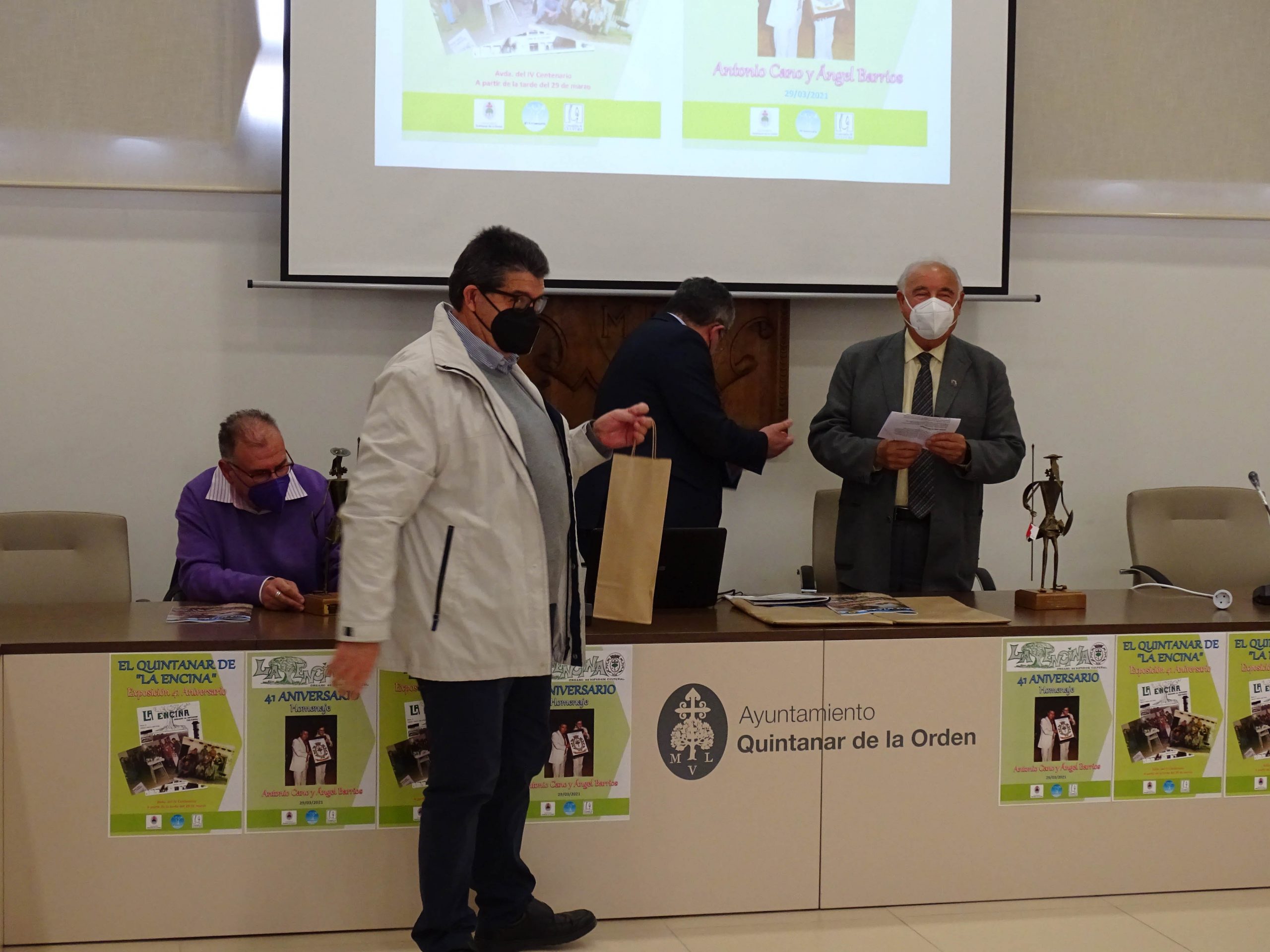 Como agradecimiento a la labor de Antonio Cano y Ángel Barrios, el alcalde les hizo entrega de un  Quijote esculpido por el escultor manchego Chema Teno. Por su parte, Antonio y Ángel entregaron también un detalle, una botella de vino, a los colaboradores presentes en el acto.