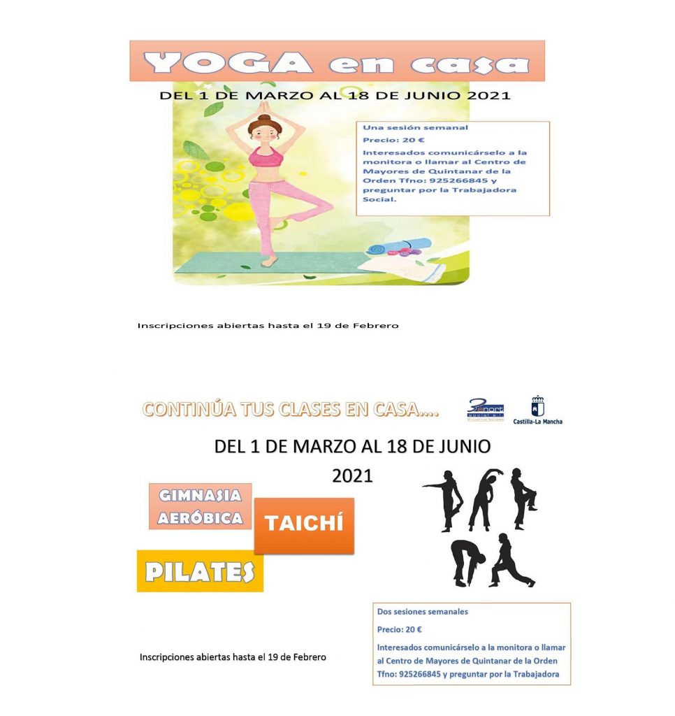 Por otro lado, también se han organizado cursos de Gimnasia Aeróbica, Pilates y Taichí en dos sesiones semanales y también al precio de 20 euros. De la misma manera, las personas interesadas en cualquiera de estos cursos pueden apuntarse llamando al Centro de Mayores.