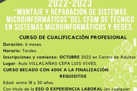 Concretamente se trata de los siguientes cursos: “Montaje y reparación de sistemas microinformáticos” del CFGM de Técnico en Sistemas  Microinformáticos y Redes, que estará becado con 400 euros a la finalización del mismo; “Elaboración de vinos y manipulación de alimentos” que estará becado con 1.000 euros al término y además se realizarán prácticas en empresa; y los módulos vinculados al grado medio de “Técnico en Estética y Belleza” que también estará becado.