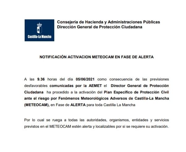 Activación del Plan Específico de Protección Civil ante el riesgo por Fenómenos Meteorológicos Adversos de Castilla -La Mancha (METEOCAM) en Fase de ALERTA para toda Castilla -La Mancha como consecuencia de las previsiones desfavorables comunicadas por la AEMET.