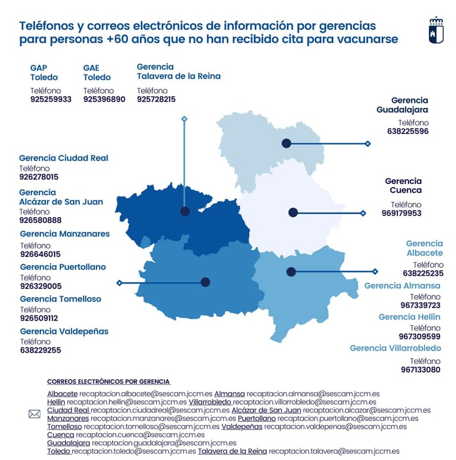 Desde la Consejería de Sanidad de Castilla –La Mancha informan que las Gerencias del SESCAM han habilitado unos teléfonos de contacto para la recaptación de personas de más de 60 años que, por alguna circunstancia ajena a su voluntad, se haya podido quedar sin vacunar.