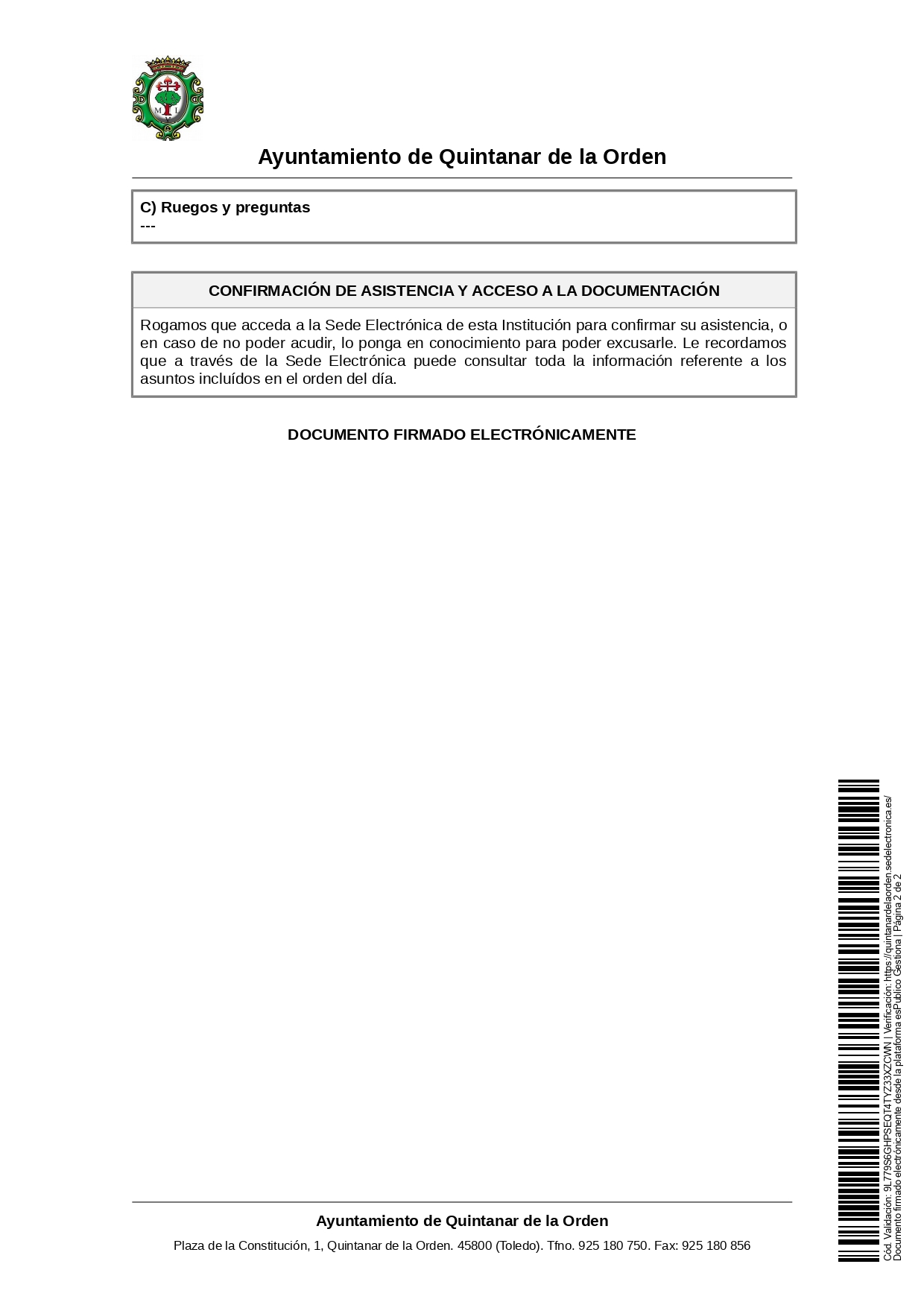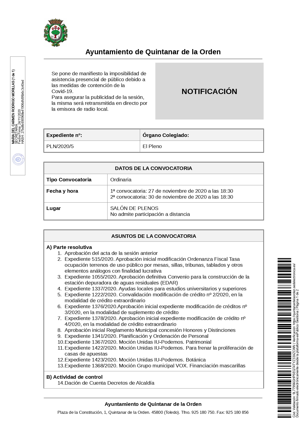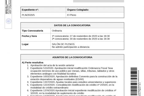 El próximo viernes, 27 de noviembre, se celebrará sesión de Pleno Ordinario en el Ayuntamiento de Quintanar de la Orden a las 18.30 horas.