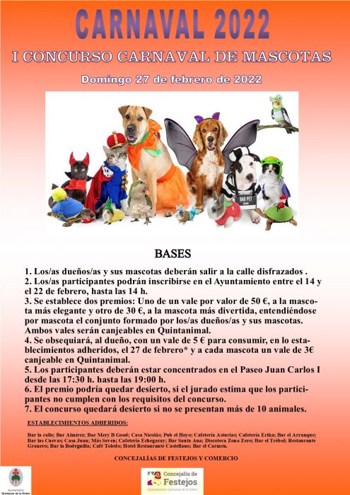 Además, se obsequiará al dueño participante con un vale de 5€ para consumir el 27 de febrero en los establecimientos adheridos que son los siguientes: La Calle, Almirez, Mery B Good, Casa Nicolás, El Hoyo, Asturias, Erika, El Arranque, Las Cuevas, Casa Juan, Más Seven, Echegaray, Santa Ana, Zona Zero, El Trébol, Granero, La Bodeguilla, Café Toledo, Castellano. Y por cada mascota se entregará un vale de 3 € canjeable en Quintanimal.