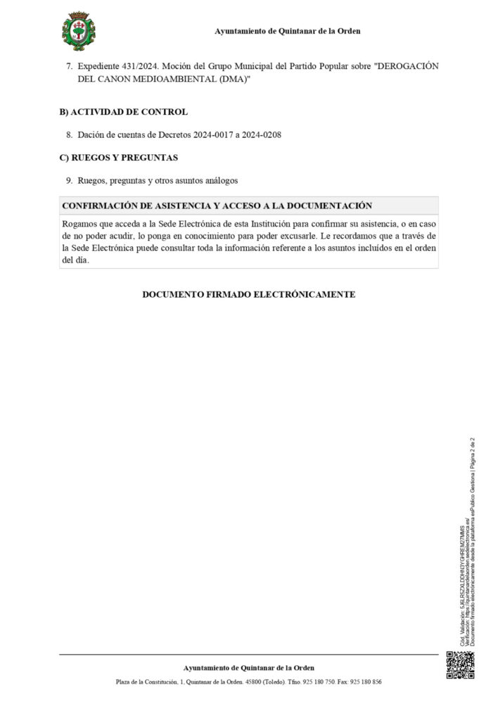 Este jueves a las 19:00h tendrá lugar, en el Salón de Plenos del Ayuntamiento de Quintanar de la Orden, el Pleno Ordinario en el que se tratarán asuntos de importancia, como la Modificación de la Plantilla de Personal 2024, la Aprobación definitiva del Presupuesto General del Ayuntamiento de Quintanar de la Orden para el Ejercicio 2024.