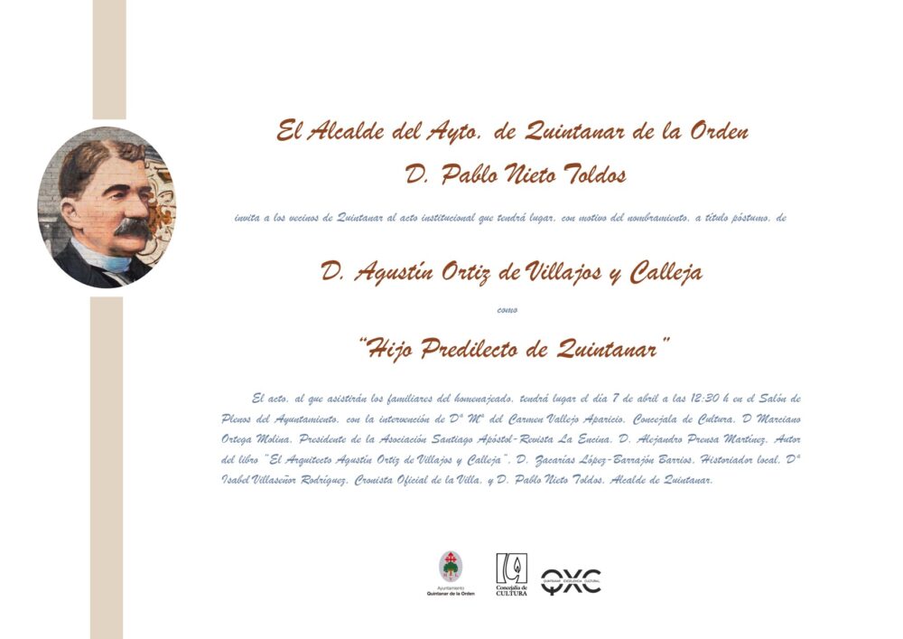 El próximo domingo 7 de abril, a las 12:30h en el Salón de Plenos del Ayuntamiento de Quintanar de la Orden, D. Agustín Ortiz de Villajos y Calleja recibirá el título de “Hijo Predilecto de Quintanar” de la mano del Alcalde Pablo Nieto Toldos.