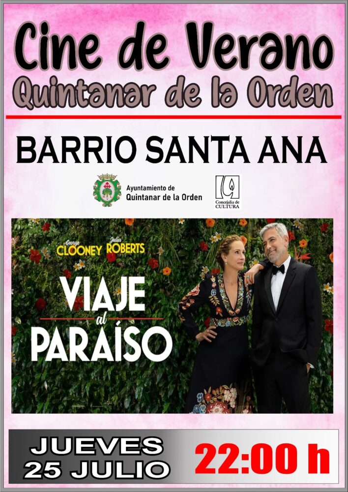 En primer lugar, el próximo jueves 25 de julio a las 22:00h se emitirá en el Barrio Santa Ana de la localidad la comedia protagonizada por George Clooney y Julia Roberts, “Viaje al Paraíso” para hacer reír a los quintanareños en estas noches de calor.