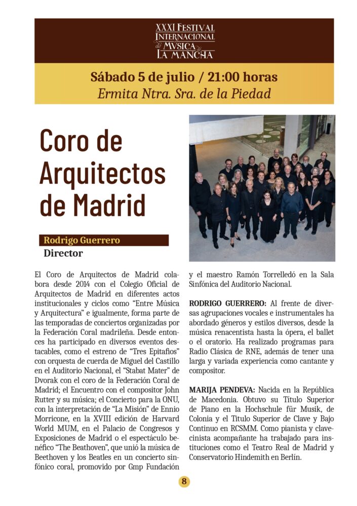 El próximo sábado 5 de julio, dentro de la programación del XXXI Festival Internacional de Música de la Mancha, se celebrará el Concierto del Coro de Arquitectos de Madrid dirigido por Rodrigo Guerrero.