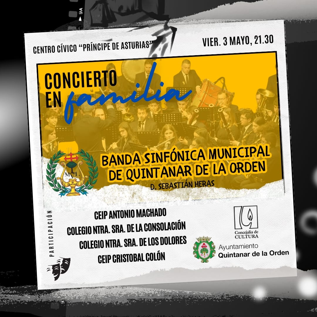 El próximo viernes 3 de mayo tendrá lugar, a las 21:30h en el Centro Cívico “Príncipe de Asturias de Quintanar de la Orden” el Concierto “En Familia” a cargo de la Banda Sinfónica Municipal y con la participación de los colegios de Quintanar de la Orden, el CEIP Antonio Machado, el Colegio Ntra. Sra. de la Consolación, el Colegio Ntra. Sra. de los Dolores y el CEIP Cristobal Colón.