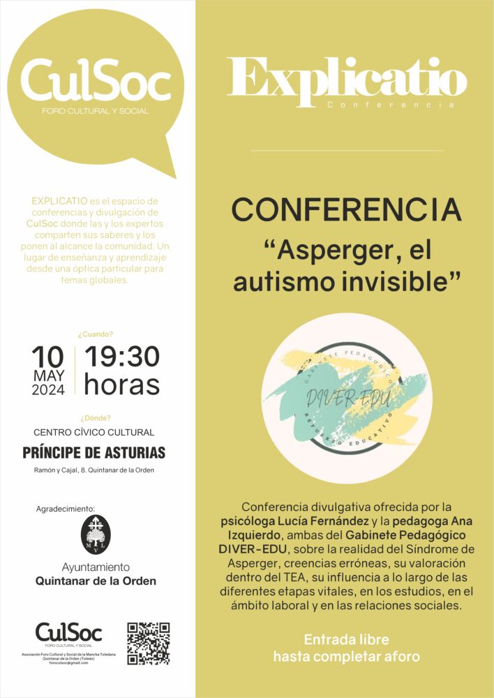 El próximo 10 de mayo tendrá lugar, en el Centro Cívico “Príncipe de Asturias”, la conferencia a cargo de CulSoc Foro Cultural y Social: “Asperger, el autismo invisible”.