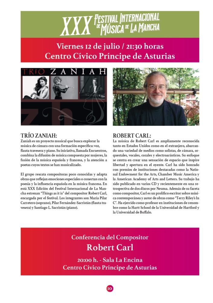 Dentro de la programación del XXX Festival Internacional de Música de la Mancha, la música de Robert Carl es ampliamente reconocida tanto en Estados Unidos como en el extranjero, abarcando una variedad de medios como solistas, de cámara, orquestales, vocales, corales y electroacústicos. Su enfoque se centra en crear una sensación de espacio que inspire libertad y apertura en el oyente.