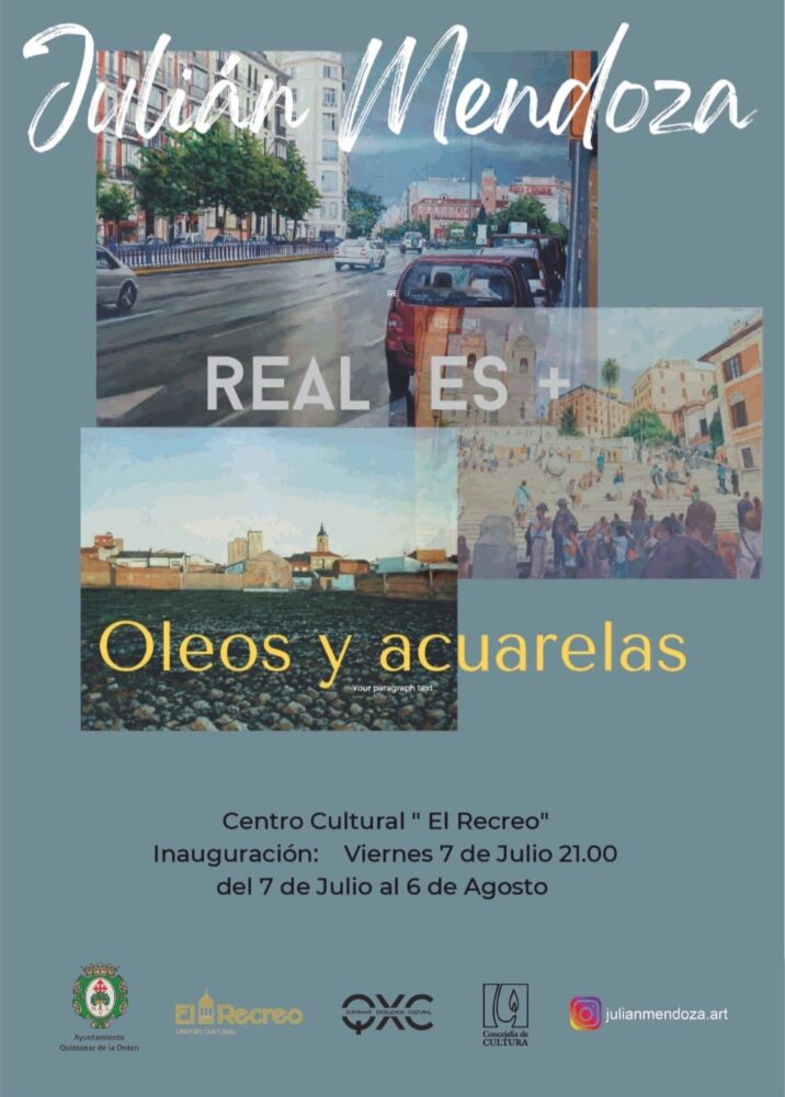 El próximo viernes 7 de julio a las 21:00h en el Centro Cultural El Recreo se inaugura la exposición REAL ES + de Julián Mendoza de oleos y acuarelas que estará hasta el domingo 6 de agosto en Quintanar de la Orden