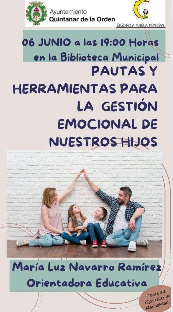 El próximo jueves 6 de junio tendrá lugar, a las 19:00h en la Biblioteca Pública Municipal de Quintanar de la Orden, la charla – taller “Pautas y Herramientas para la gestión emocional de nuestros hijos”, a cargo de María Luz Navarro Ramírez, orientadora educativa.
