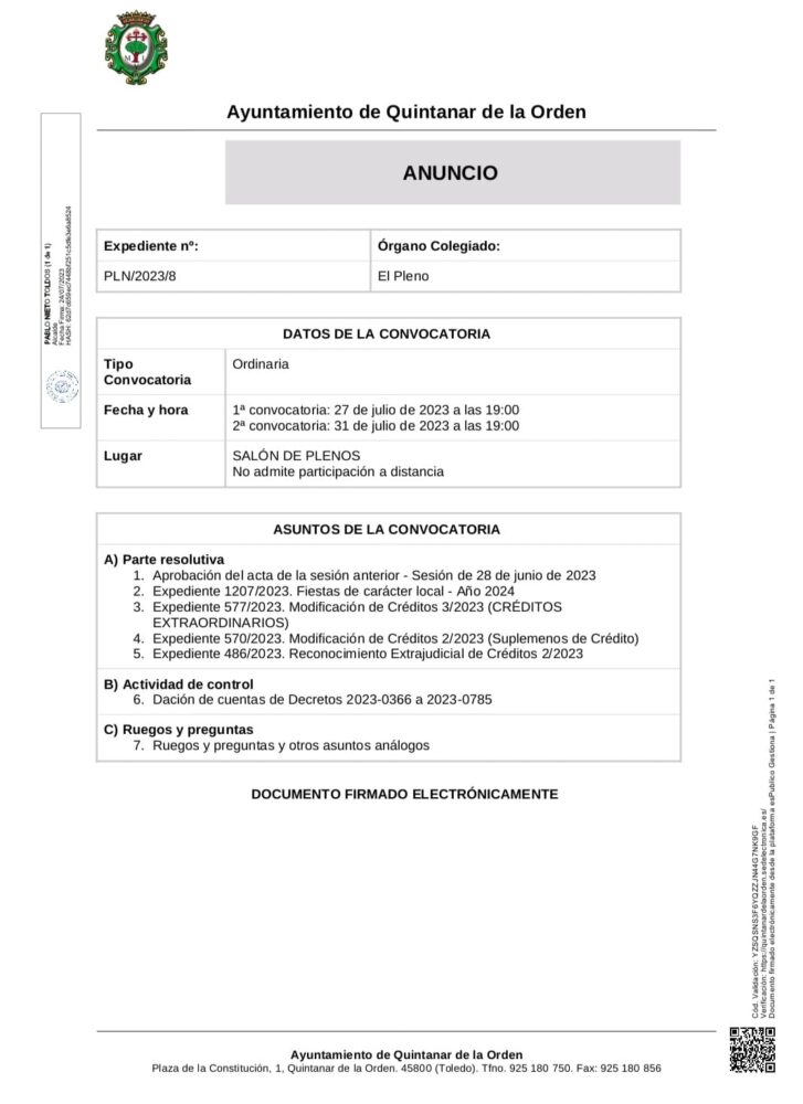 El próximo jueves 27 de julio a las 19:00h habrá PLENO en el Salón de Plenos del Ayuntamiento de Quintanar de la Orden ‼️