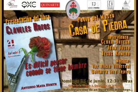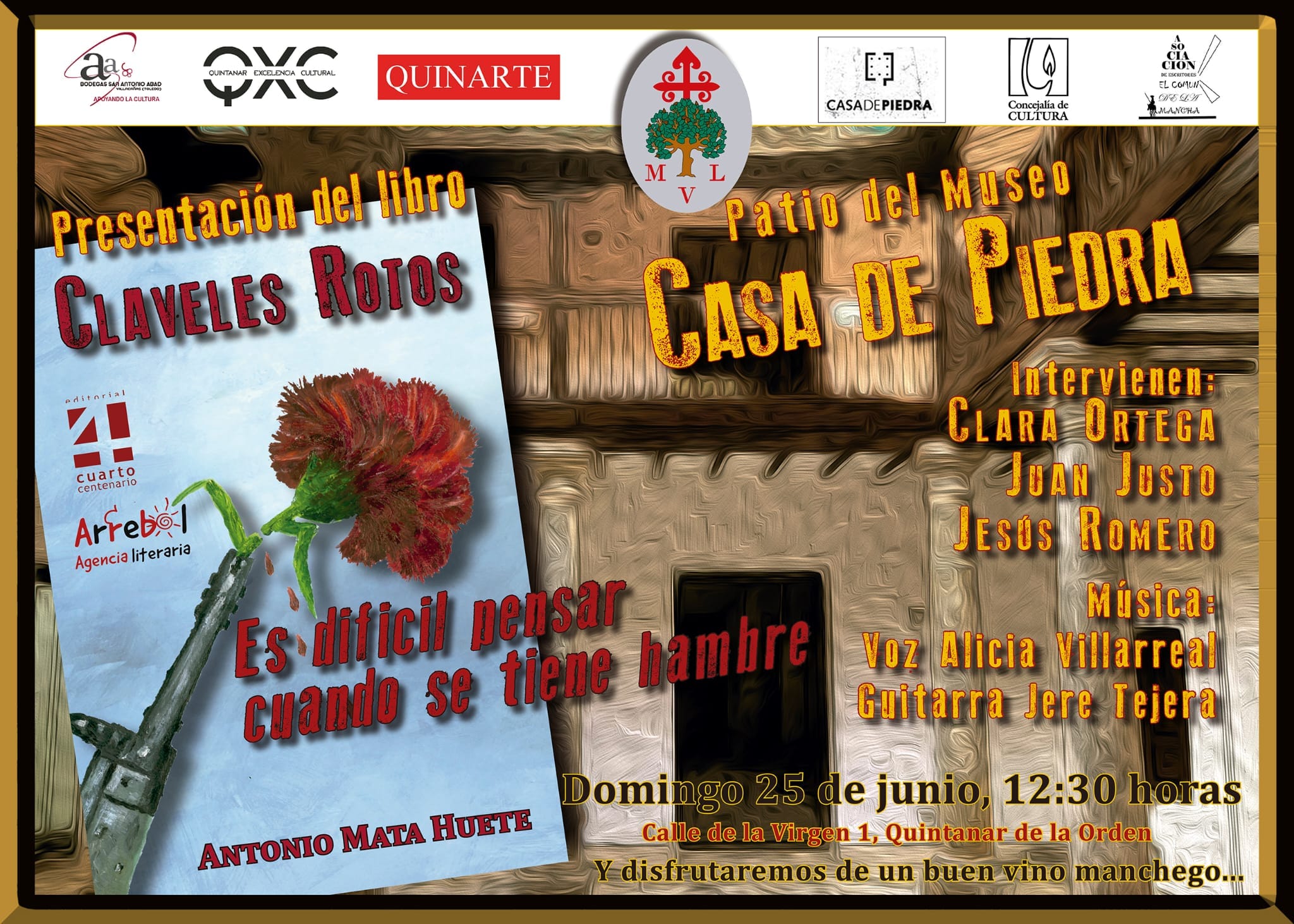 El próximo domingo 25 de junio a las 12:30h en el Patio del Museo de la Casa de Piedra de Quintanar de la Orden se presentará el libro “Claveles rotos” de Antonio Mata Huete
