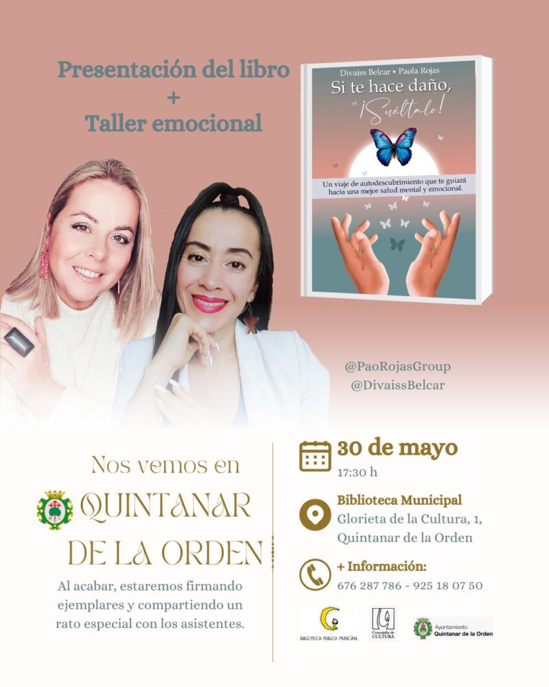 El próximo viernes 30 de mayo se celebrará en Quintanar de la Orden la presentación del libro y taller emocional de @PaoRojasGroup y @DivaissBelcar “Si te hace daño, ¡Suéltalo!.