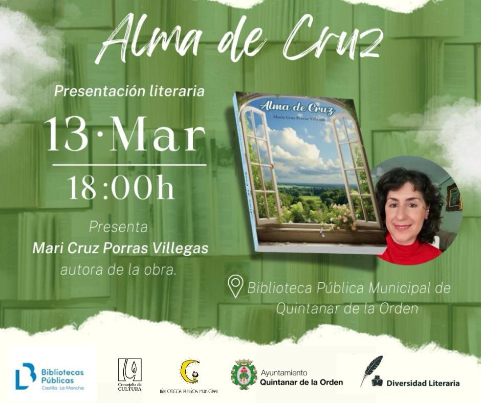 El próximo 13 de marzo se celebrará en la Biblioteca Pública de Quintanar de la Orden el libro “Alma de Cruz” a cargo de su autora, Mari Cruz Porras Villegas.