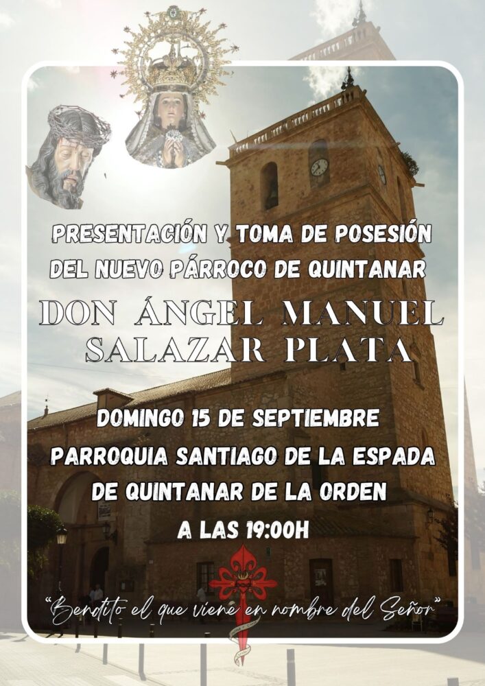 El próximo domingo 15 de septiembre a las 19:00h tendrá lugar la presentación y toma de posesión del nuevo Párroco de Quintanar de la Orden, D. Ángel Manuel Salazar Plata.