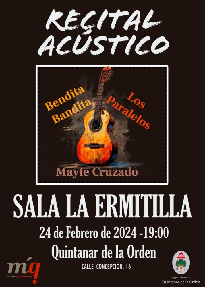 El sábado 24 de febrero a las 19.00 horas, tendrá lugar un recital acústico en la Sala La Ermitilla de Quintanar, con “Bendita Bandita”, “Los Paralelos” y “Mayte Cruzado”.