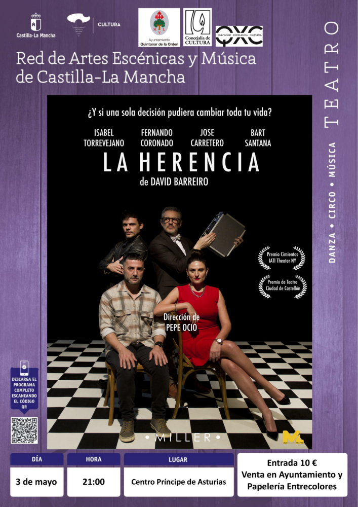 El próximo sábado 3 de mayo se celebrará en el Centro Cívico “Príncipe de Asturias” el teatro “La Herencia”, de David Barreiro y las actuaciones de Isabel Torrevejano, Fernando Coronado, José Carretero y Bart Santana.