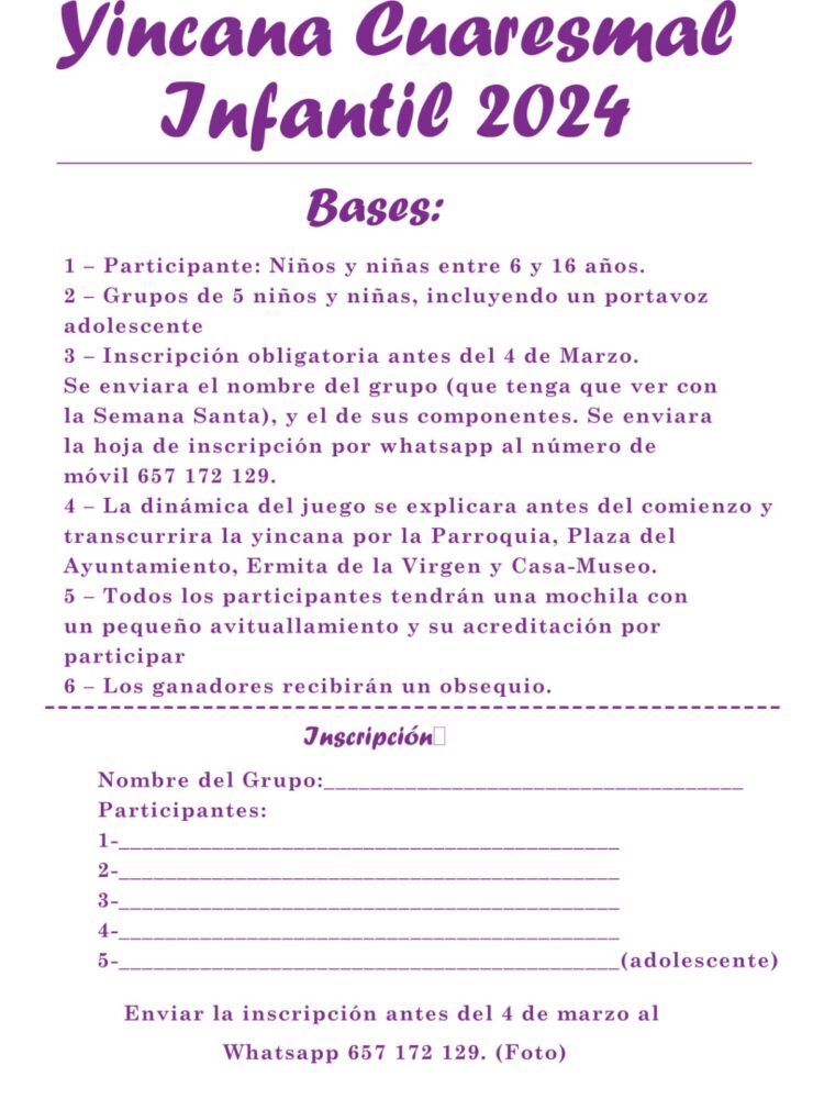El próximo domingo 10 de marzo tendrá lugar una Yincana Cuaresmal Infantil a las 16.30 horas, dirigida a niños y niñas de 6 a 16 años.