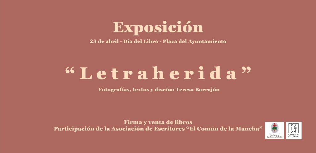 El próximo 23 de abril para conmemorar el Día del Libro tendrá lugar una exposición en la Plaza del Ayuntamiento “Letraherida” con fotografías, textos y diseño de Teresa Barrajón.