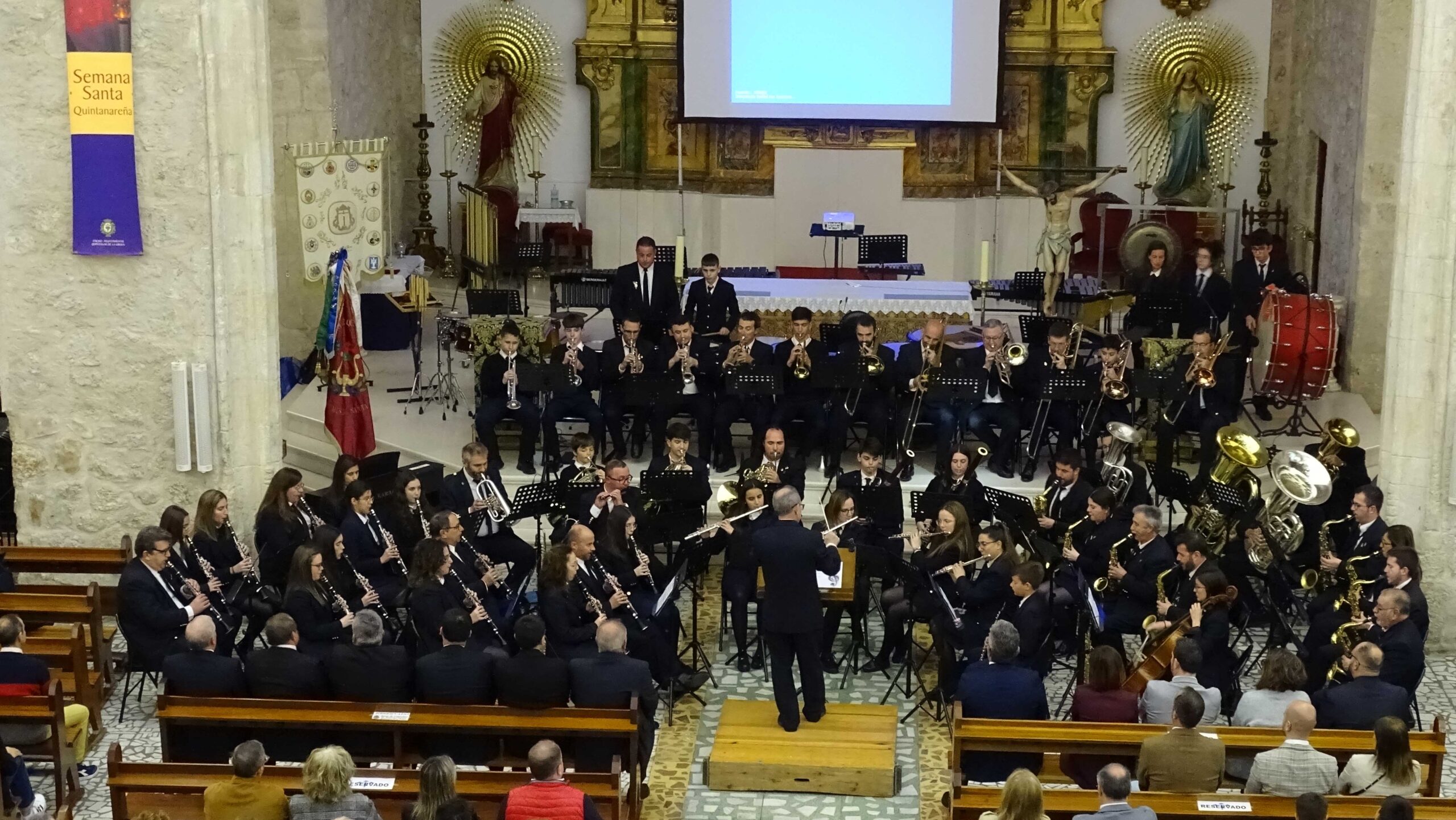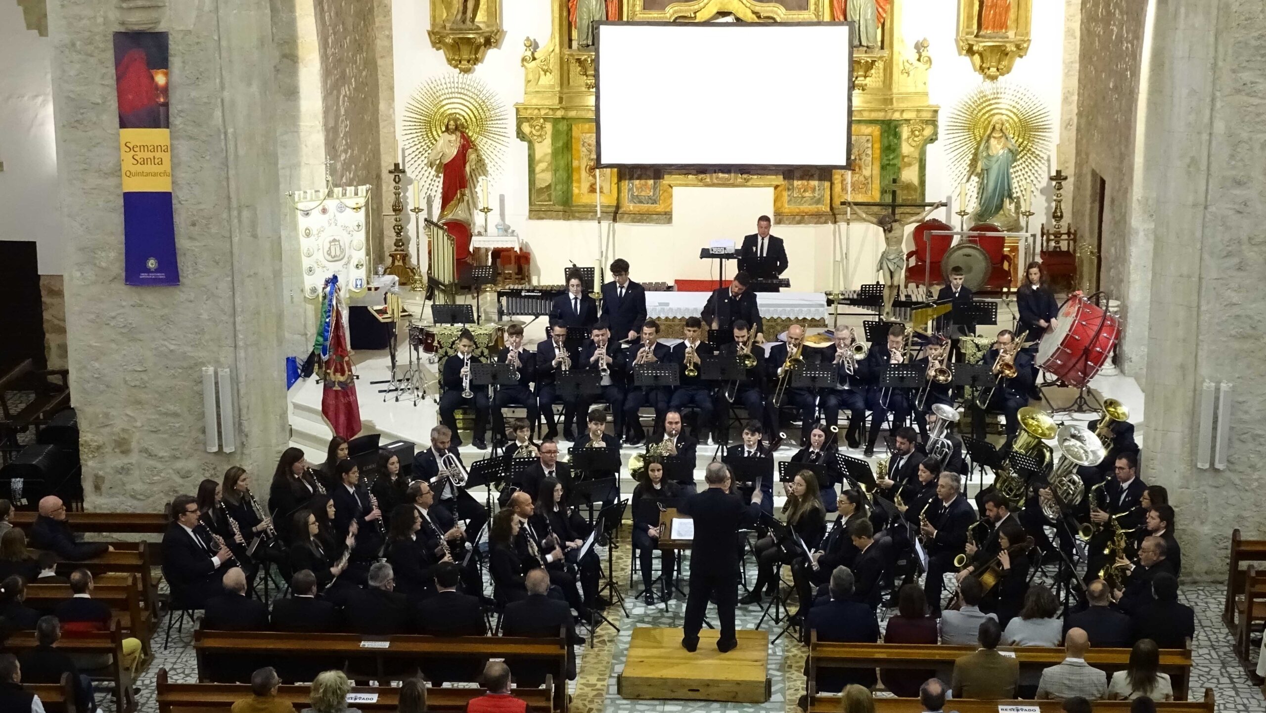 El concierto se inició con la marcha procesional “Virgen del Castillo Viejo” de Rodrigo Alfredo de Santiago Majó; y continuó con el poema sinfónico “Juan, El Bautista” y otras marchas de procesión como “Camino del Sepulcro” y “Perdónalos” de David Rivas Domínguez. También resonó en el Templo “The Sound of Silence” de P. Simon, “Consuelo Gitano” de Antonio Velasco Rodríguez, “The Bells of Sagrada Familia” de Satoshi Yagisawa; y “Al tercer día” de A. Blanco Hernández y J. Nevado García. Durante el descanso del concierto, además se hicieron entrega de los premios del concurso de dibujo que cada año organiza la Junta de Cofradías para hacer partícipes a los escolares y Centro Educativos de la Semana Santa Quintanareña.