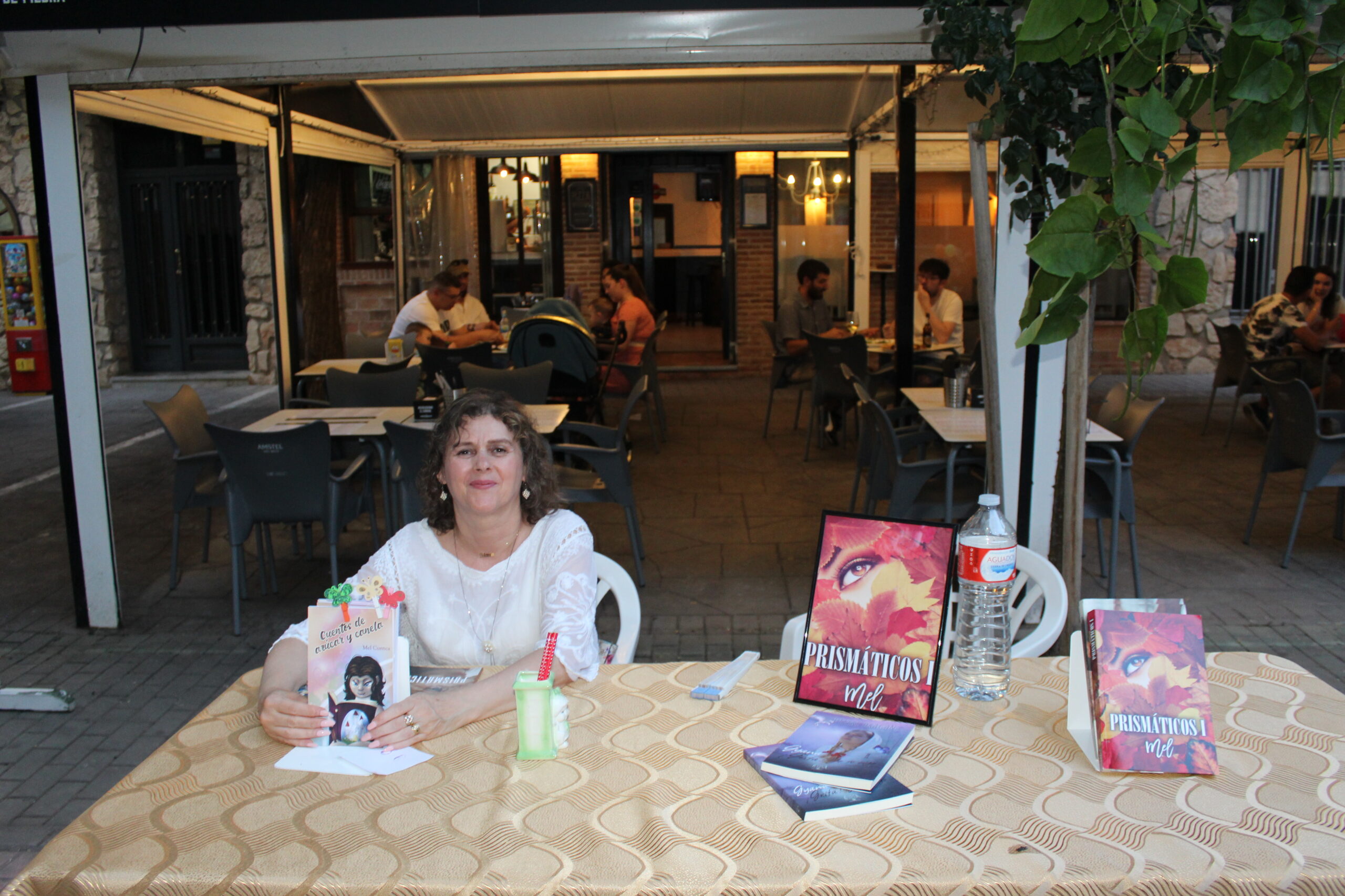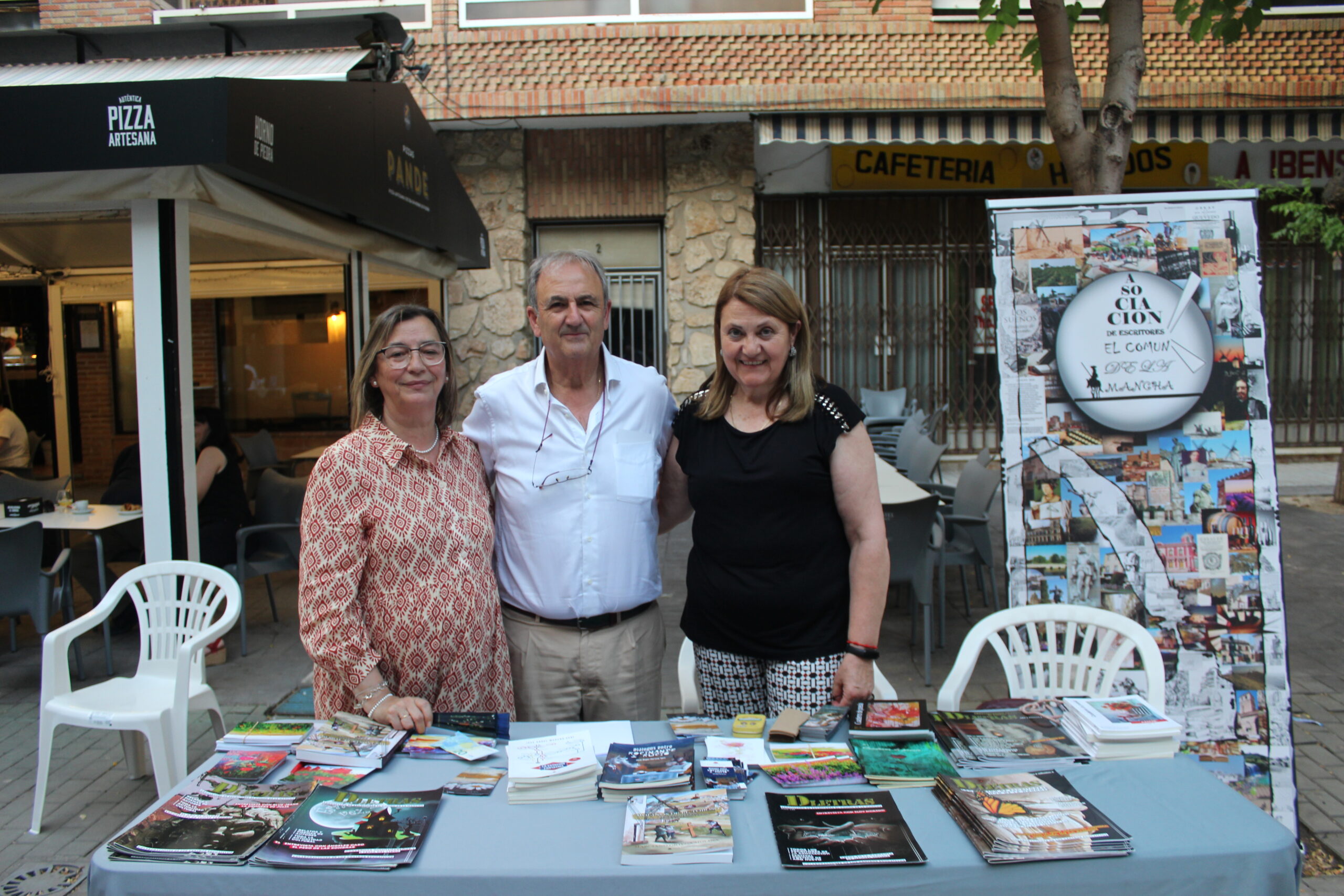 Ocho eran las mesas expuestas a lo largo del paseo. Siete de ellas de autores y, una de la Asociación con sus publicaciones como son la Revista D Letras y el Cuaderno de poesía.