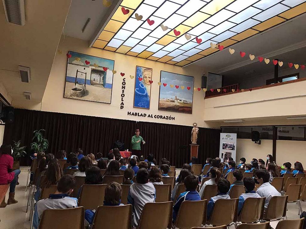 El lunes era el Colegio Público Cristóbal Colón y el Colegio Ntra. Sra. de los Dolores quienes tenían la posibilidad de disfrutar de esta original forma de contar cuentos. Mientras que el martes, era el Colegio Ntra. Sra. de la Consolación, Colegio Público Antonio Machado y Asprodiq los que no perdían detalle de las historias de Roberto Mezquita.