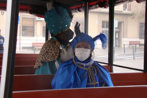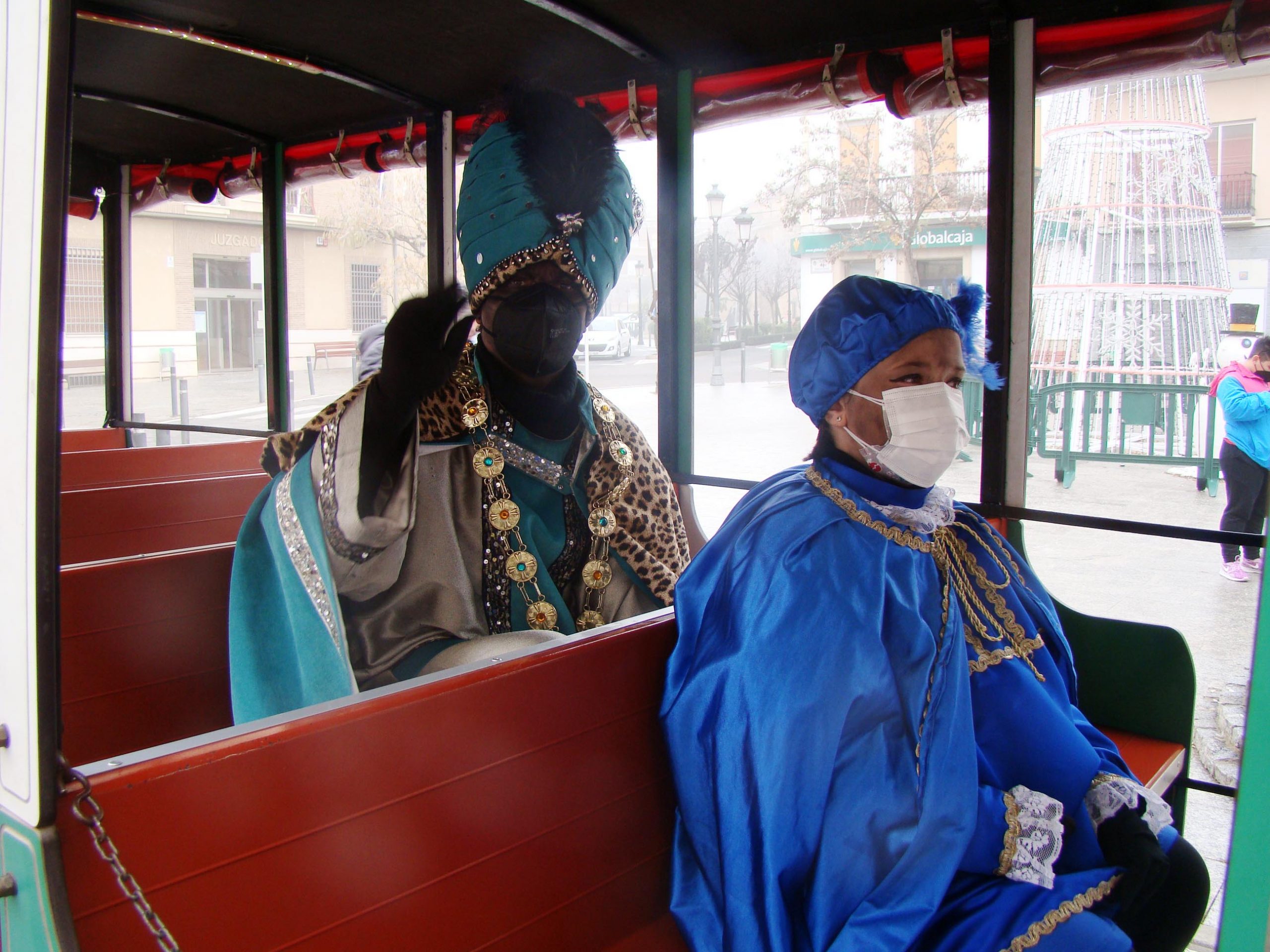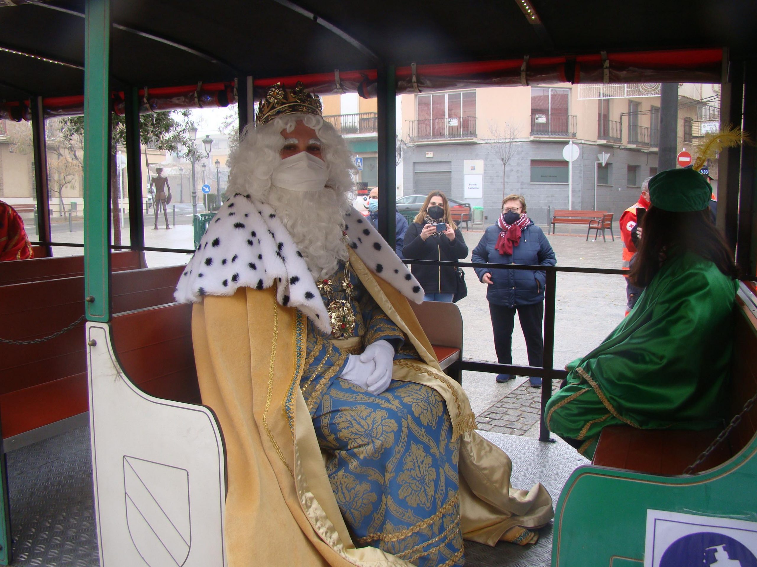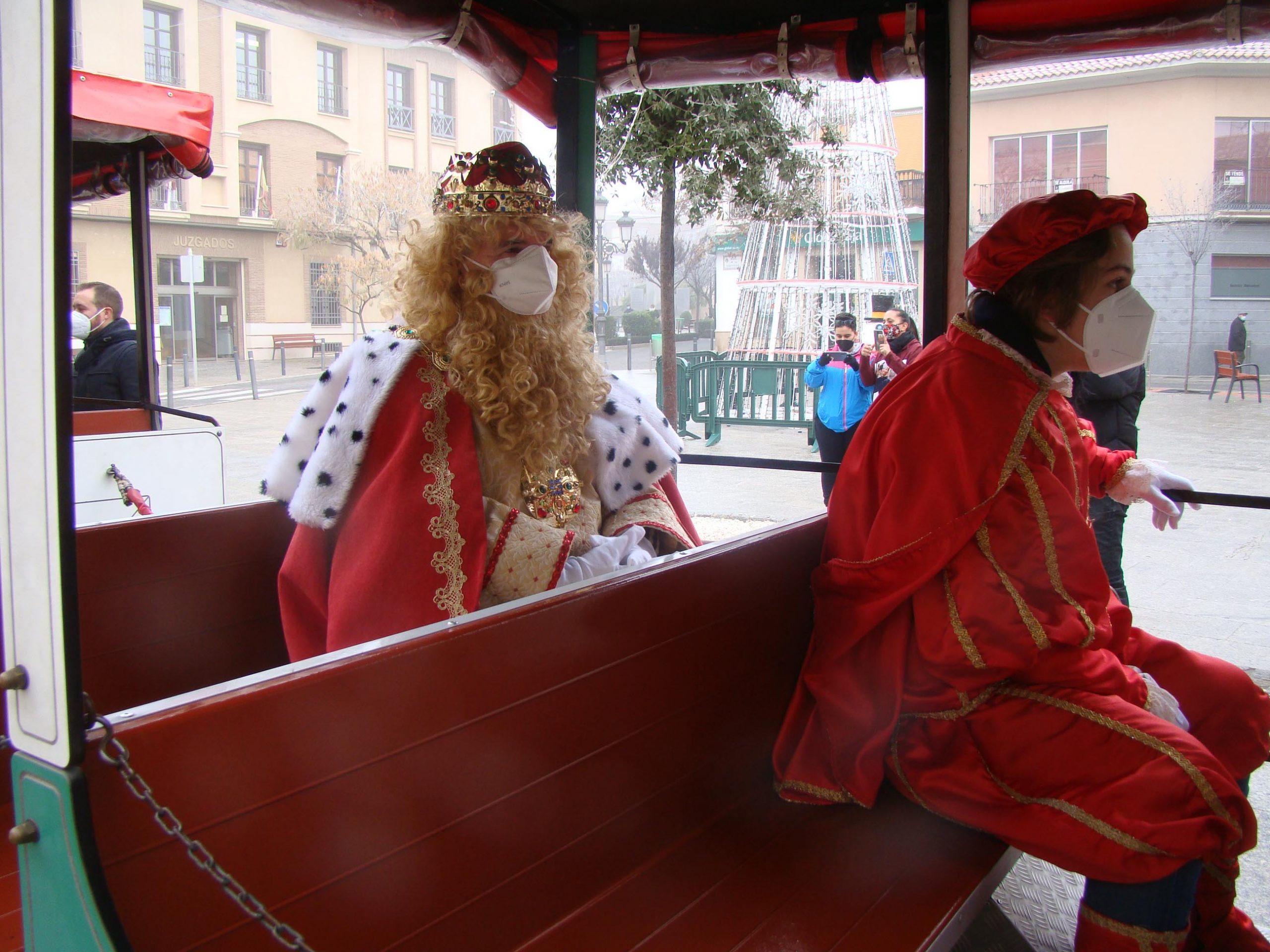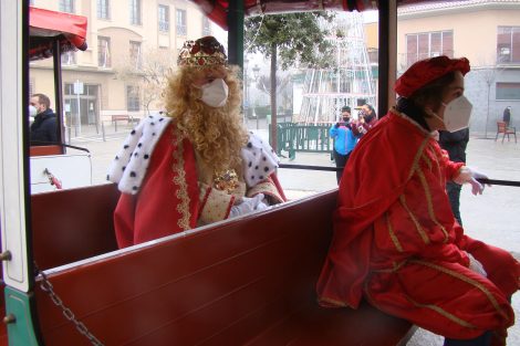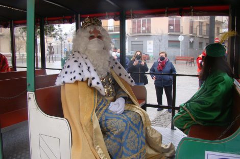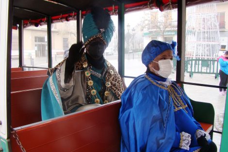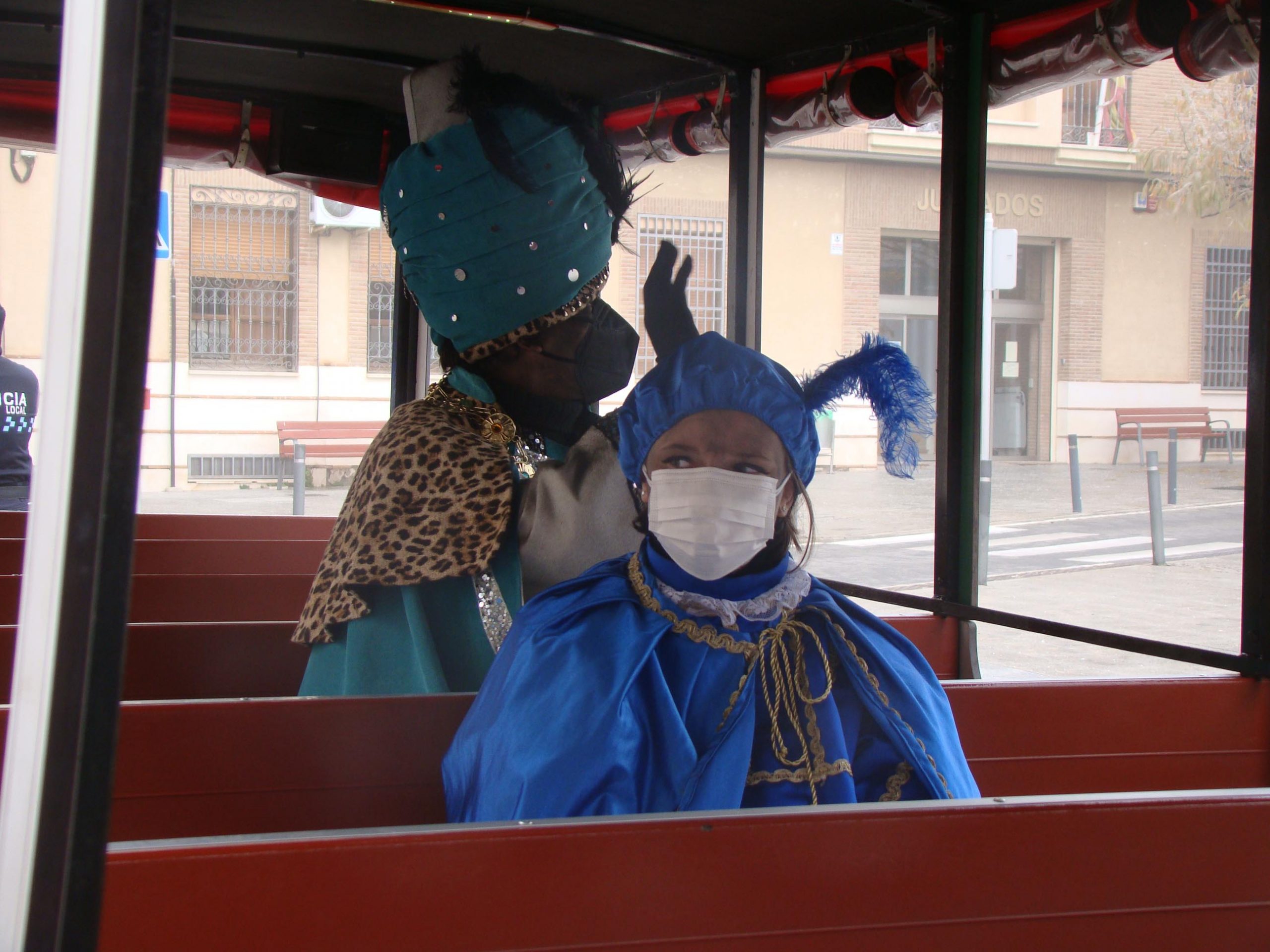 Tras el recibimiento, Melchor, Gaspar y Baltasar, acompañados de sus pajes, se subían a un tren neumático que ha recorrido los diferentes barrios del municipio para saludar a los niños y niñas.