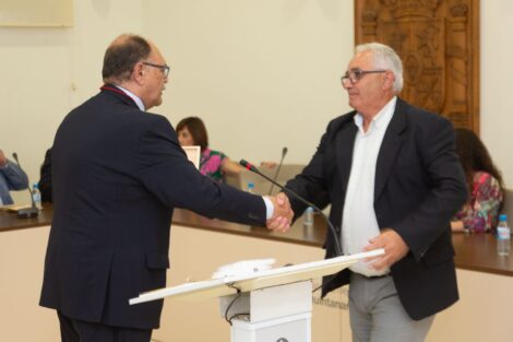 El Secretario de la Corporación ponía a Pablo la medalla de mandado de Alcalde de la localidad y le cedía la presidencia. En ese momento, pasaba a presidir el pleno y ponía uno a uno las medalla corporativa a todas y todos los miembro de la corporación