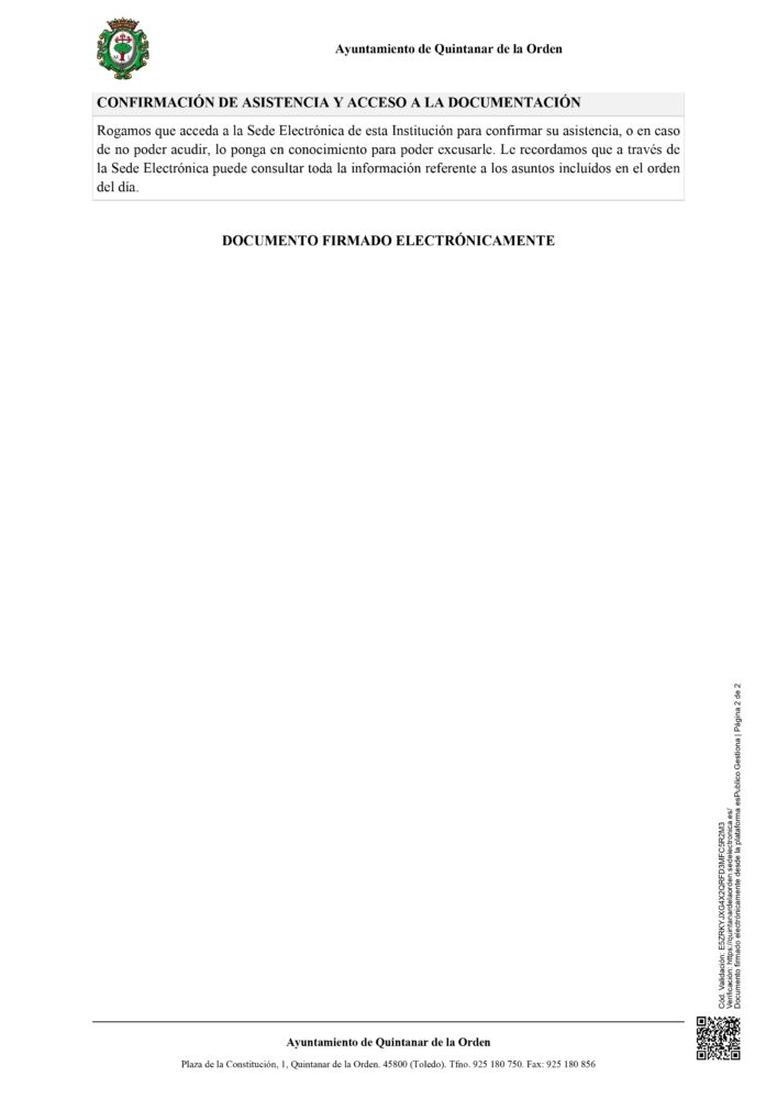 El próximo jueves 31 de julio se celebrará en el salón de plenos del Ayuntamiento de Quintanar de la Orden el Pleno Ordinario, donde se tratarán diferentes puntos de interés.
