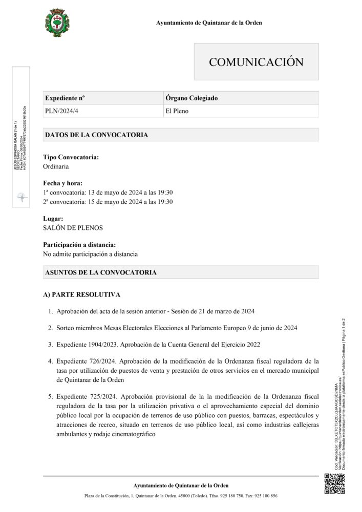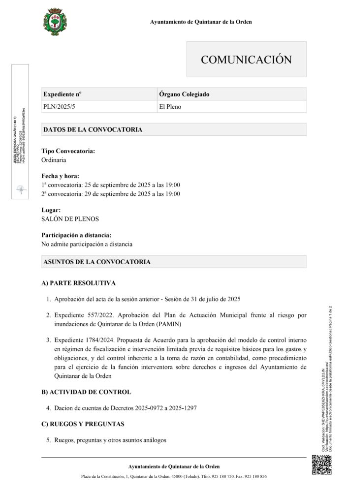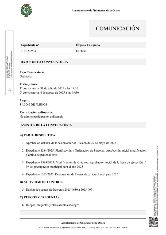 El próximo 31 de julio tendrá lugar en el Salón de Plenos del Ayuntamiento de Quintanar de la Orden el Pleno Ordinario, donde se tratarán diversos puntos de interés...