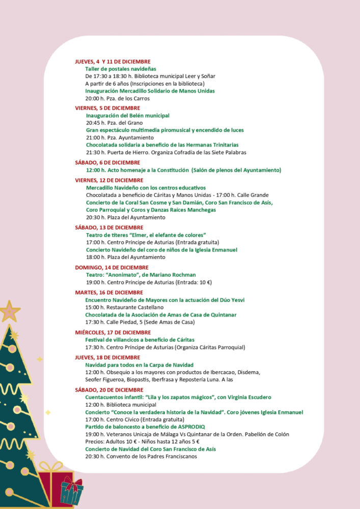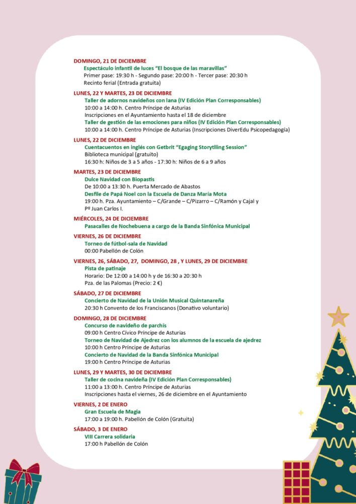El extenso programa incluye talleres infantiles, mercadillos solidarios, espectáculos multimedia, conciertos de coros locales, actividades deportivas solidarias, cuentacuentos, festivales escolares, teatro o pista de patinaje. También se mantienen tradiciones destacadas como el desfile de Papá Noel, los actos de Nochevieja, y la Cabalgata de Reyes, que este año introduce como novedad la entrega de caramelos al finalizar el recorrido para evitar riesgos.
