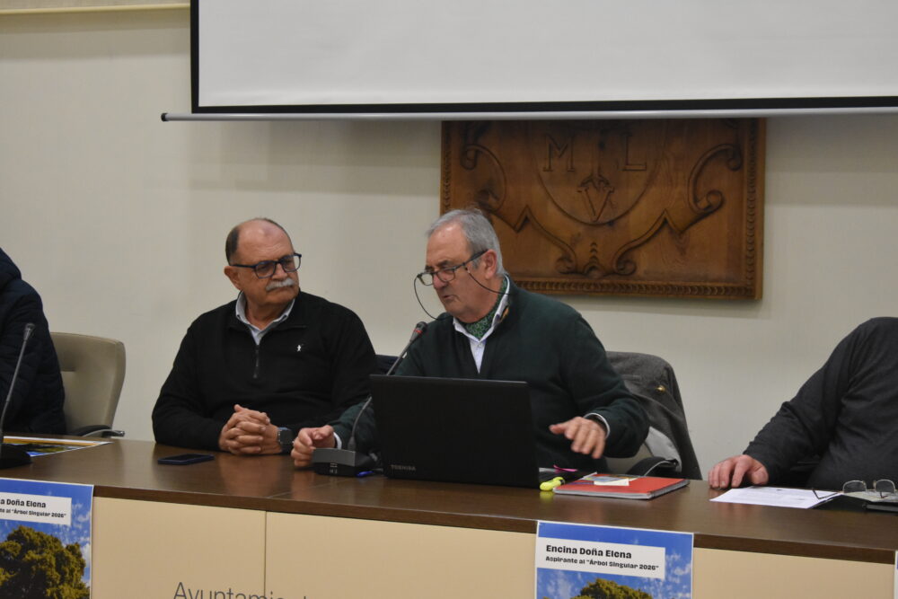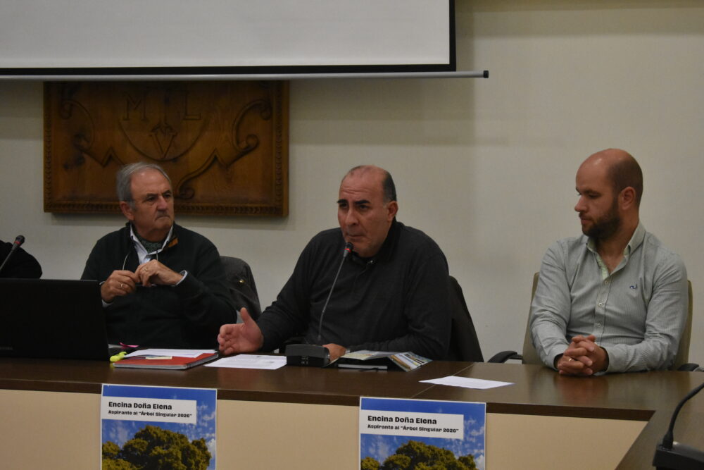 Ortega aportó también datos recientes sobre el ejemplar, explicando que la Encina Doña Elena alcanza 14,5 metros de altura, cuenta con un tronco de 4,5 metros de perímetro y presenta una copa de unos 24,5 metros de diámetro, lo que refleja su monumentalidad y excelente estado de conservación. Subrayó además que este año muestra un esplendor especial, con una abundante producción de bellotas que recuerda su histórica importancia como recurso alimenticio en épocas de escasez.