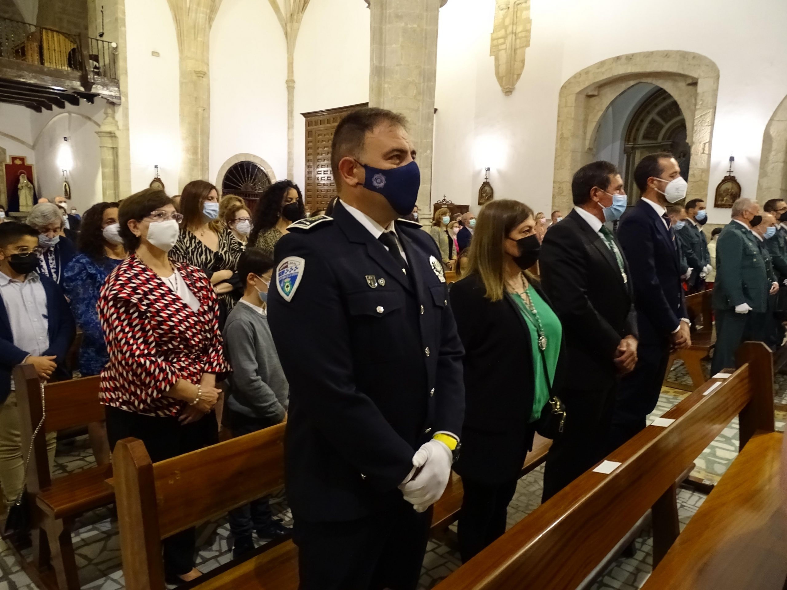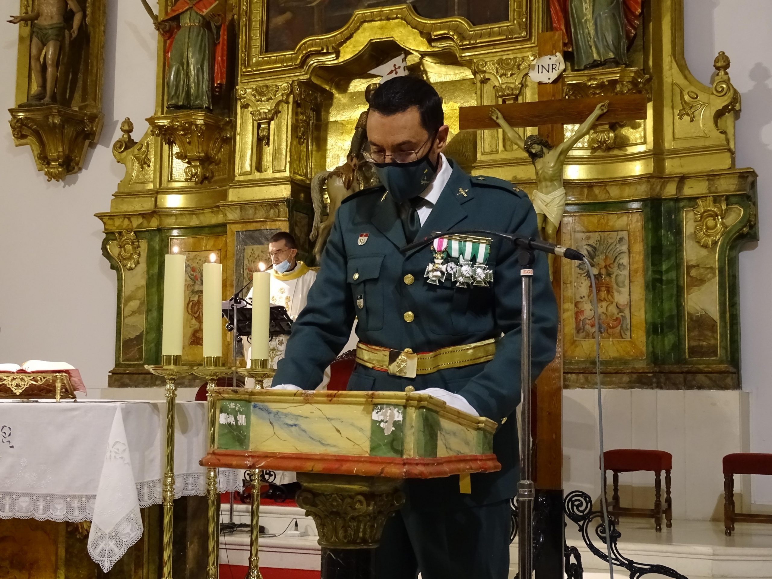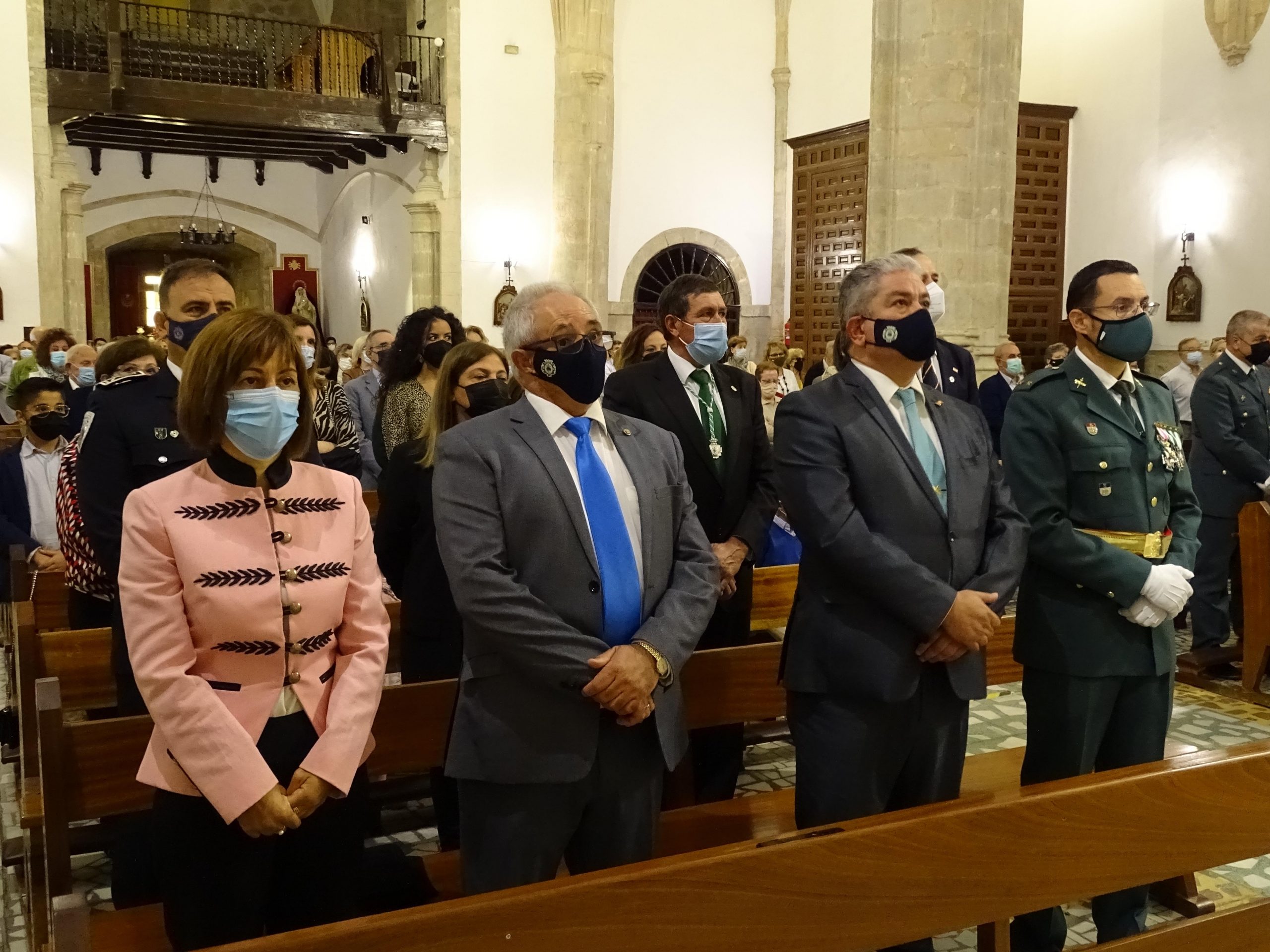 Acompañando al teniente de la Guardia Civil, Antonio Núñez, que dirigía unas palabras al inicio de la misa, estaban el jefe de la Policía Local, Alejandro Villanueva; el alcalde, Juan Carlos Navalón y concejales de la Corporación Municipal.